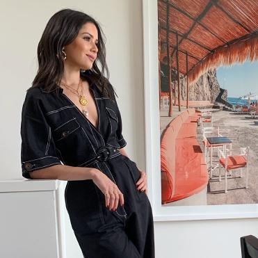 Nikki wears the Naomi Black Linen Jumpsuit and the Ines Linen Button Shirt.