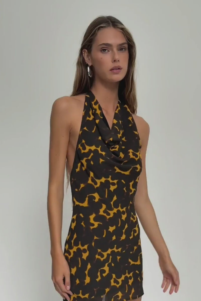 The Biba Mini Dress is designed to make an impact. Featuring a draped halter neckline and an open back, this sleek mini skims the body for a flattering, effortless fit. Finished in a bold tortoiseshell print, it strikes the perfect balance between statement and wearability. Made for warm nights, late dinners, and wherever the night takes you.