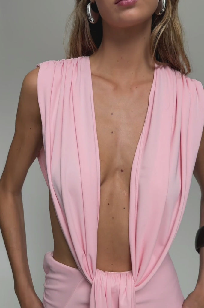 The new Jasmine gown in pink is a versatile and elegant piece. Featuring a cut-out waist and draped tie top that can be worn many different ways. A delicate tie at the back of the neck can be adjusted for further versatility. Crafted from a slinky jersey fabric that hugs and drapes in all the right places, and finished with a floor-length fit.