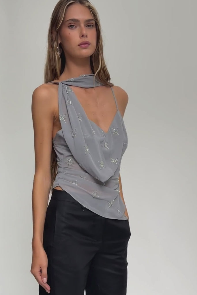 The Marina Top has delicate cami straps and a softly draped neckline. This silhouette skims the body with a fluid, lightweight feel. Subtle star embellishments add a delicate shimmer, while the asymmetric hem and scarf detail bring movement and versatility. The Marina top is an elevated piece designed to transition seamlessly from evening to event styling.