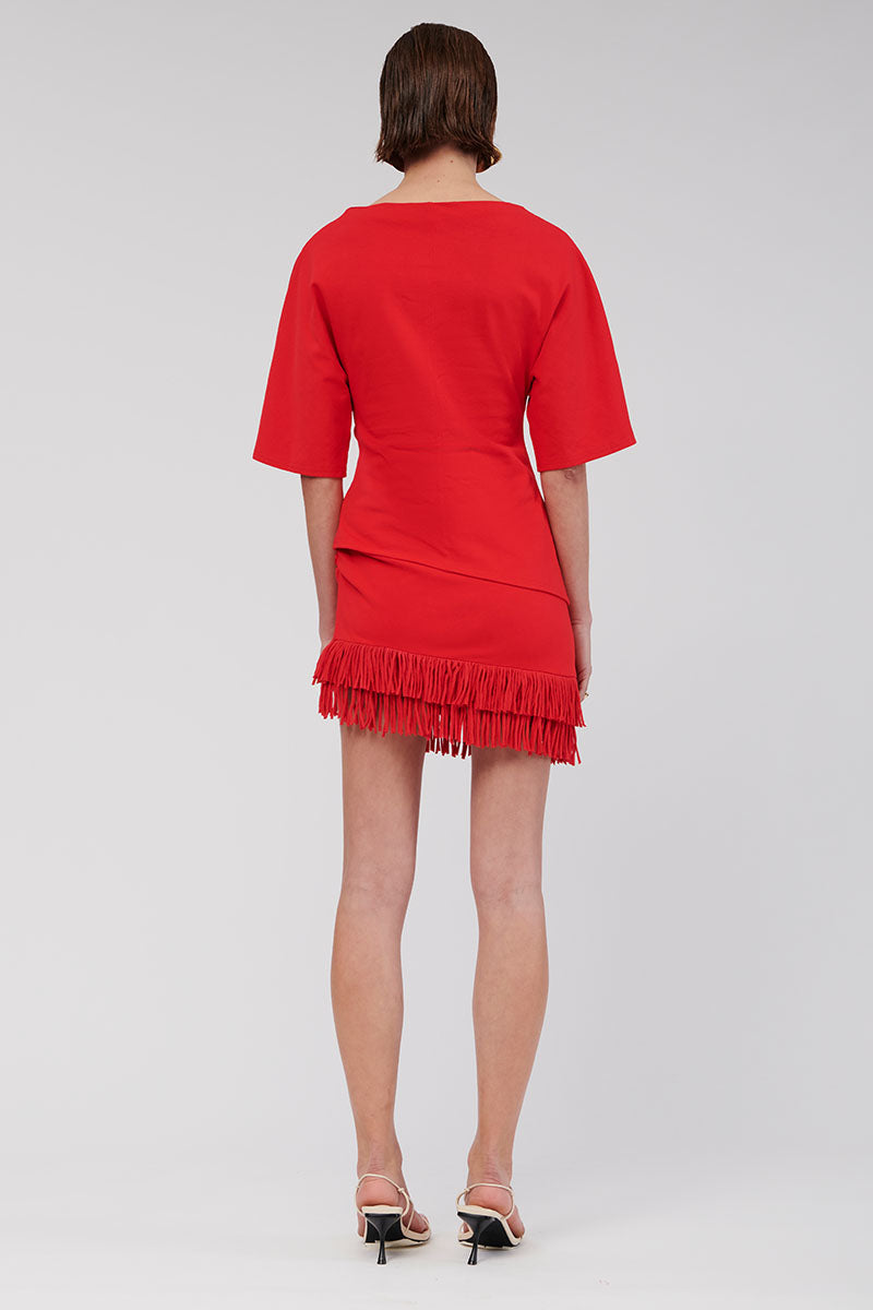 The Carmen Mini Skirt is a modern yet feminine piece. Its design features two layers of elongated fringe, a gathered finish at the front side, and a pull-on style. Designed to sit at mid-waist, it is crafted from a substantial cotton blend, offering a structured yet flattering feminine silhouette. Pair it with the matching Carmen top for a complete look.