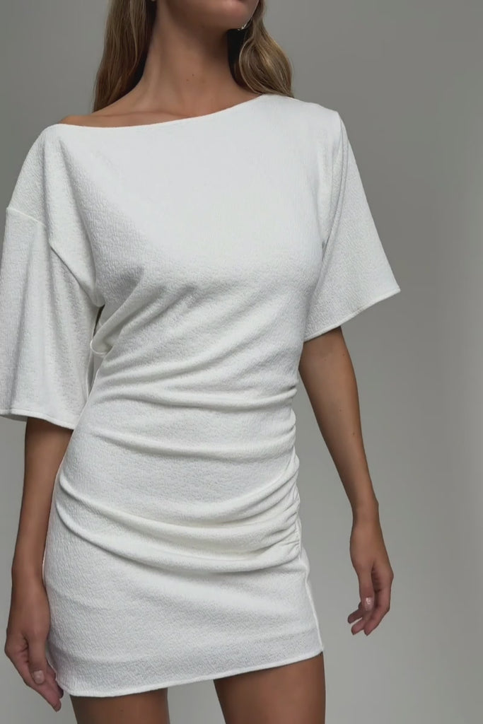 The Kristen Mini Dress is a modern take on understated elegance. Designed with a relaxed boat neckline that ever so slightly drapes off the shoulder, and soft short sleeves, this silhouette skims the body with gentle ruching through the waist for a flattering fit. Finished in crisp white, it strikes the perfect balance between minimal and elevated. An effortless option for day-to-night styling.