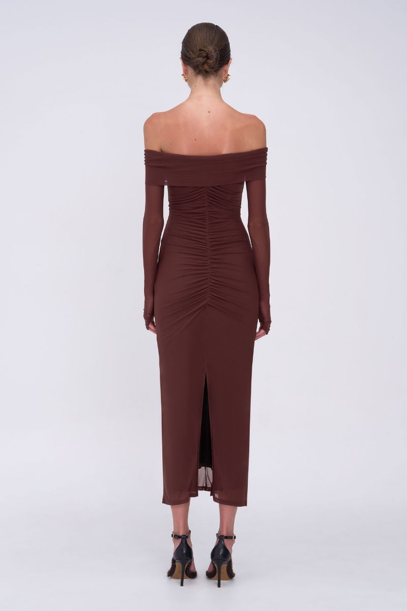Christy Mesh Off Shoulder Midi Dress - Espresso