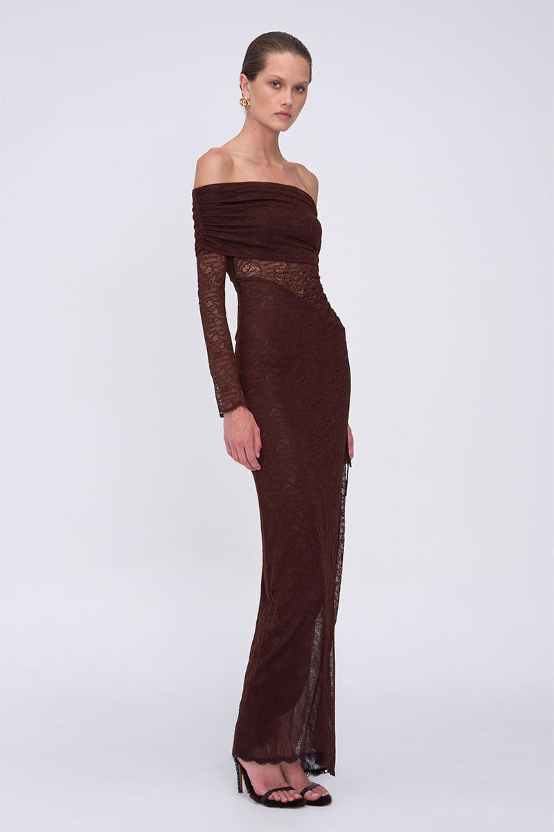 The Paris Off Shoulder Ruched Side Maxi Dress is crafted in stretch lace, blending a sculptural off-shoulder neckline with subtle, functional detailing. The asymmetrical skirt panel and adjustable side ruching contour the form, while long fitted sleeves balance boldness with coverage. Designed for impact—refined, textural, and effortlessly confident.