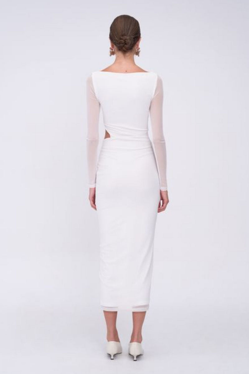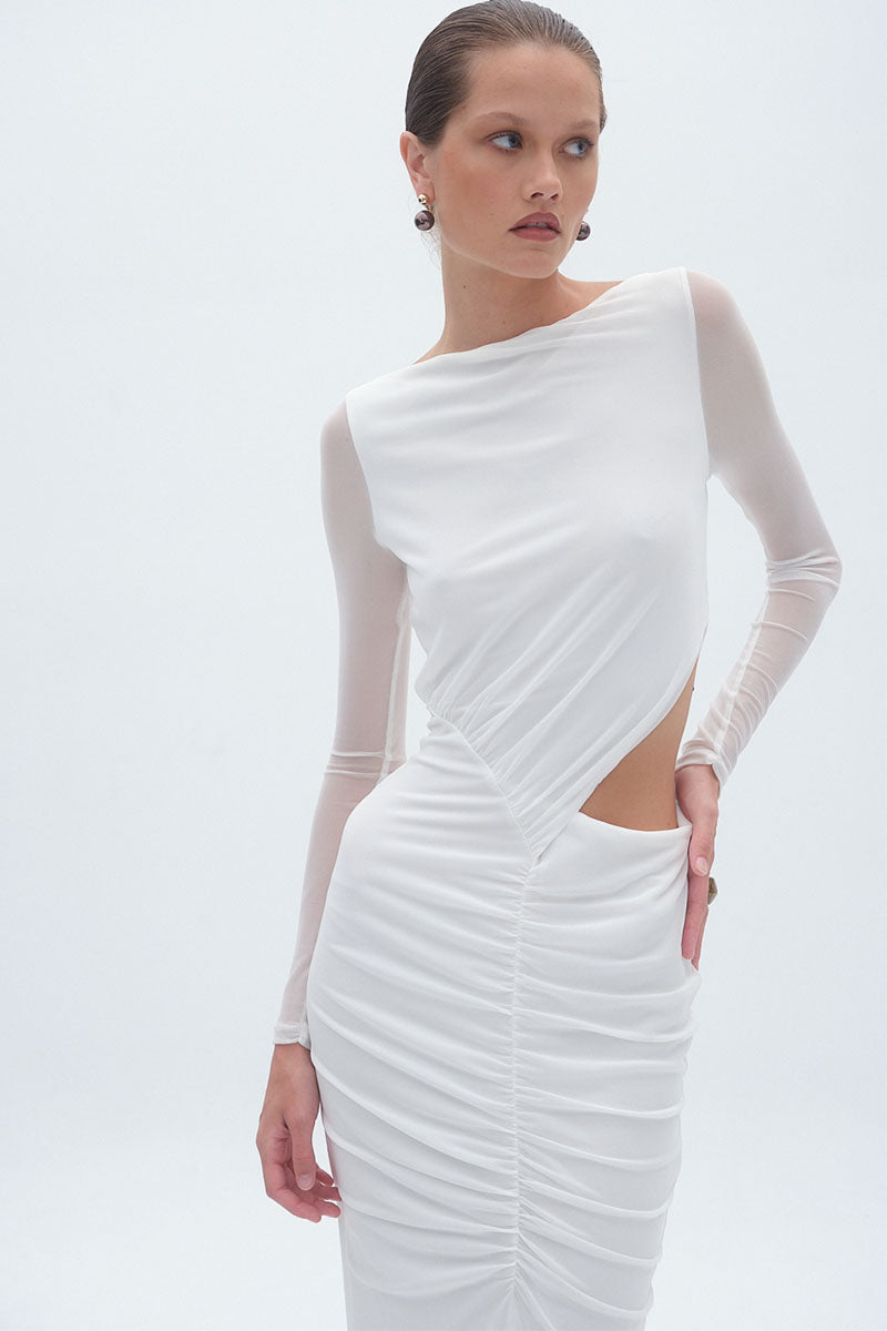 Christy in white is what happens when sheer goes sculpted. Long sleeves, ruched front, and just enough lining to leave room for imagination. She’s not bridal. She’s not basic. She’s Bondi rooftop at golden hour — camera off, confidence on. You didn’t plan to be the best dressed, but here we are.