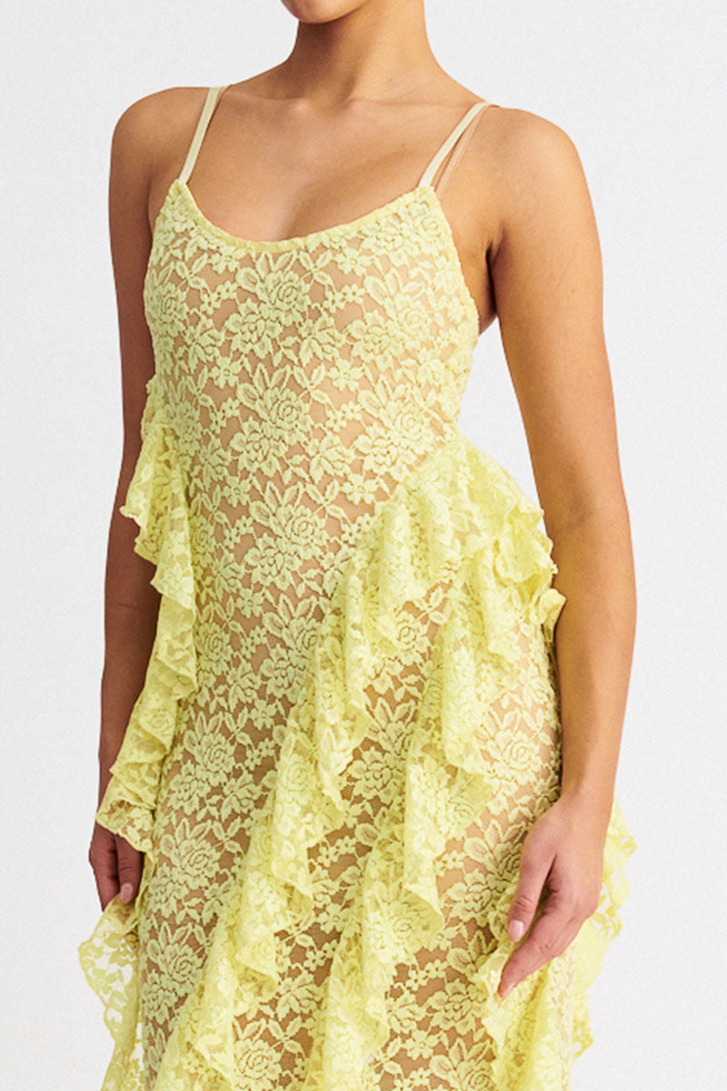 The Gemma Lace Strappy Maxi Dress features integrated slip and adjustable strap design combined with lace and layered frill drapery that definitely give it a chic and elegant vibe. The soft lemon color is perfect for capturing that sunny, festive spirit. It’s a great choice for making a statement while staying cool and comfortable.