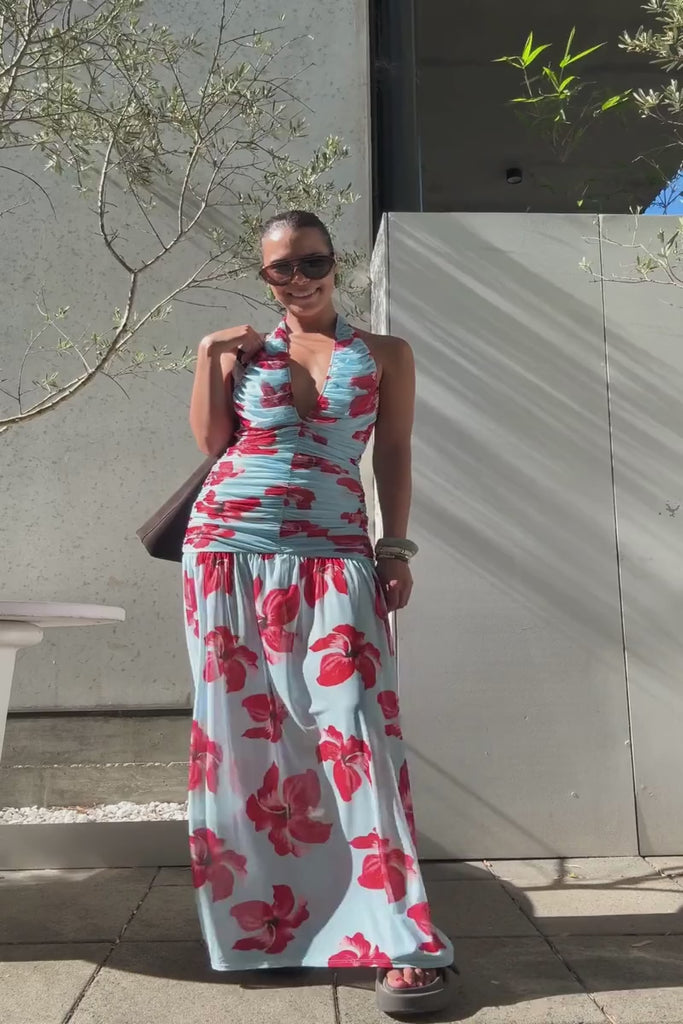 Chloe Floral Halter Mesh Plunge Maxi Dress – Blue Pink