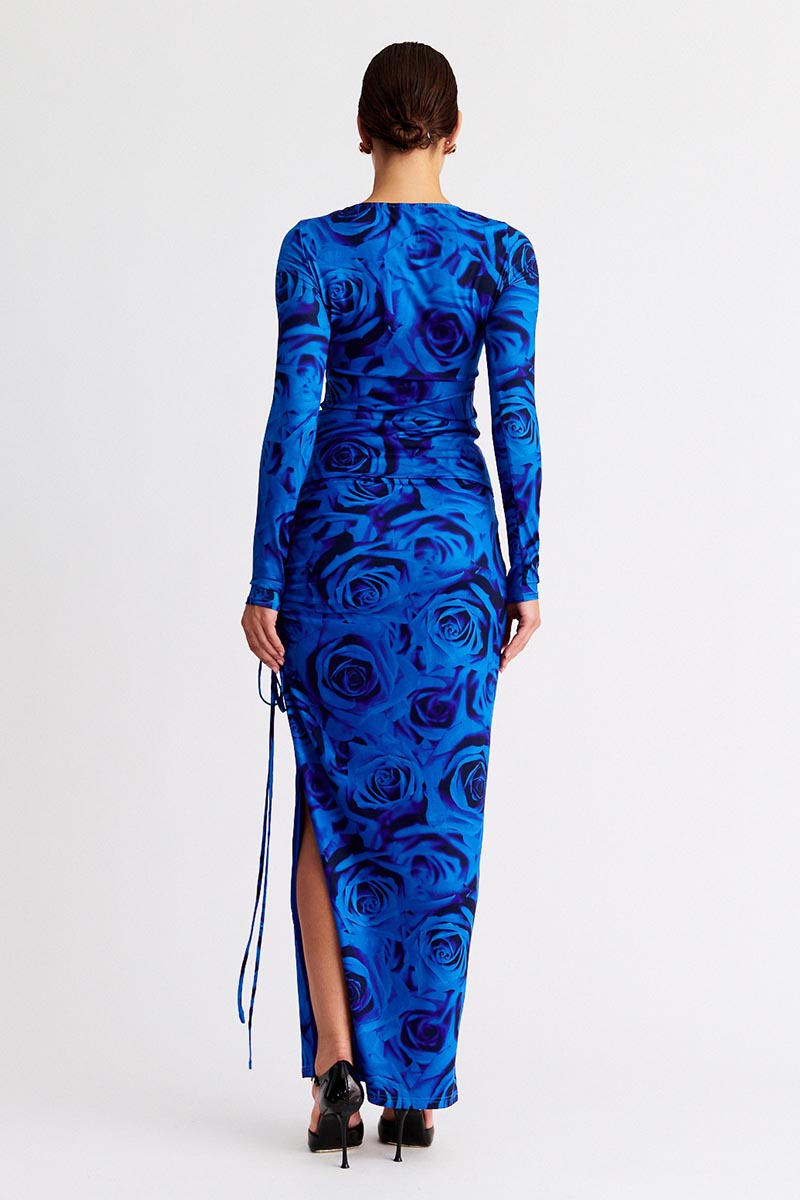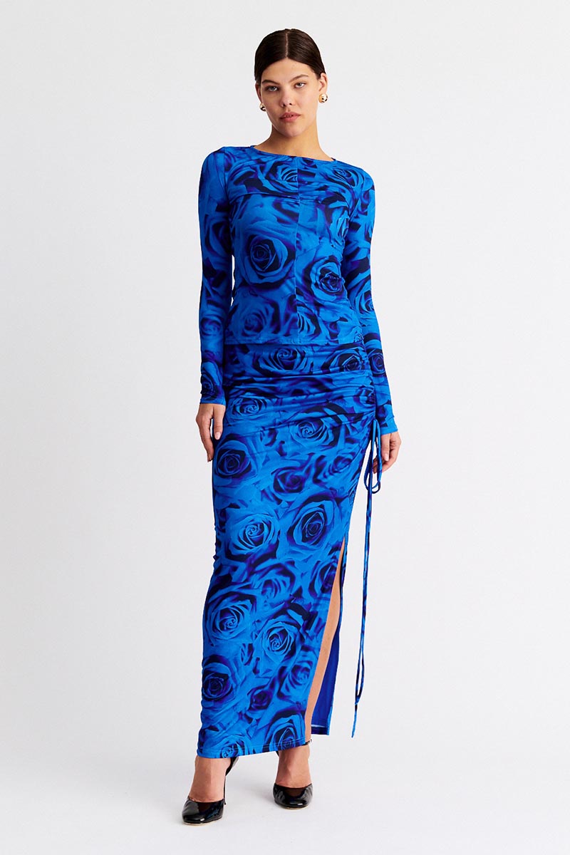 The Verona Long Sleeve Top in rose print features a modern silhouette in captivating electric blue. The top's classic round boat neck is enhanced by flattering tuck details at the center bust and long sleeves. The eye-catching oversized rose print makes a bold statement. Crafted from stretch jersey, this top is effortlessly pull-on for a sleek, chic look. Best styled with high-waisted skinny pants or a low-rise mini.